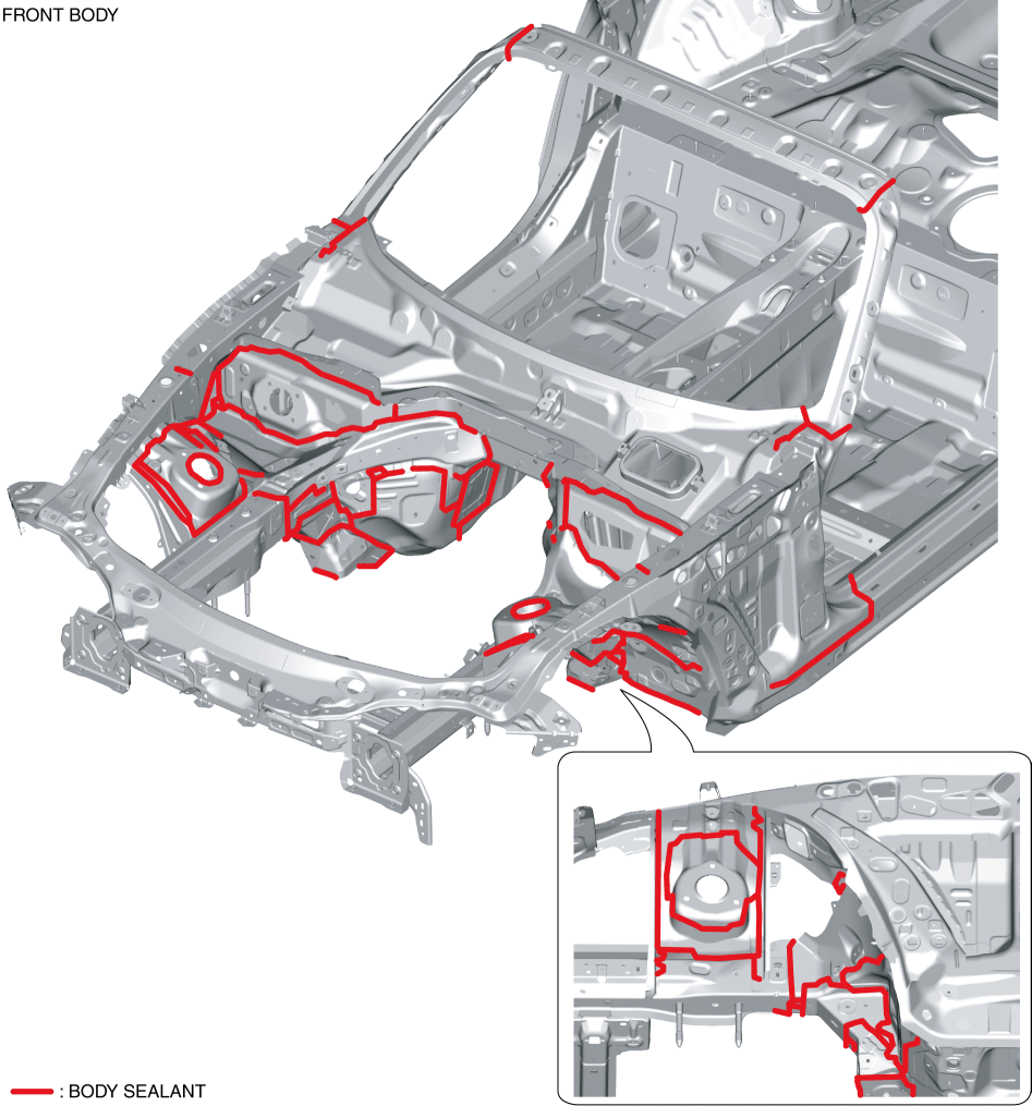 • Sealant is applied to the parts where the panels meet and to the hemmed parts of the door panel and hood panel to provide water proofing and rust proofing.