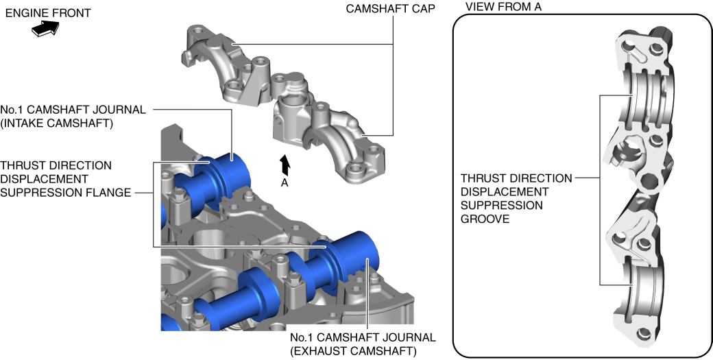• The camshaft thrust force is suppressed by the No.1 journal.