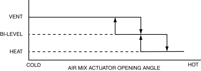 • When the temperature is set to 29 °C or 84 °F, the air mix actuator opening angle is fixed at fully open, and when set to 15 °C or 60 °F, it is fixed at fully closed.