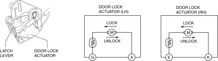 • The door lock actuator operates the built-in motor in the unlock direction and the latch lever releases when an inner/outer handle is operated.