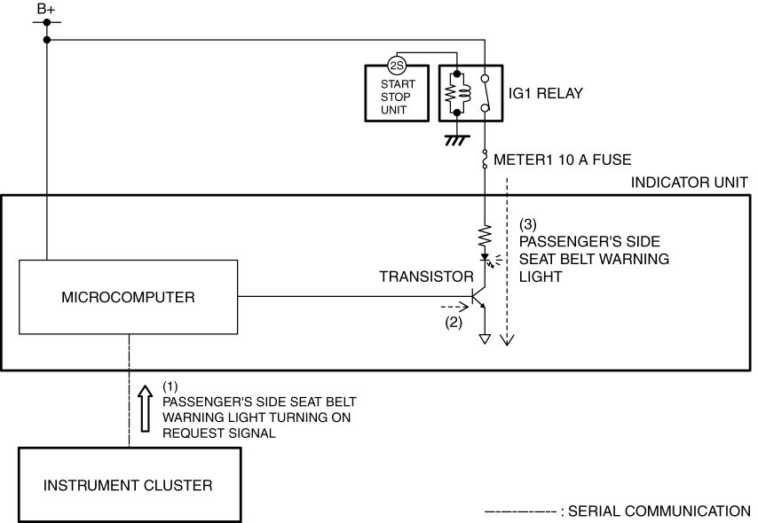 The indicator unit turns the passenger’s side seat belt warning light on/off based on the request signal sent from the instrument cluster.