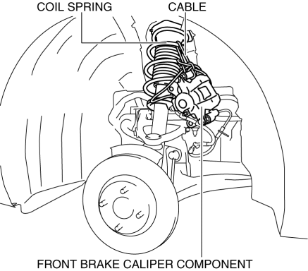 2. Remove the front brake caliper component and suspend it in a place out of the way using a cable. (See FRONT BRAKE (DISC) REMOVAL/INSTALLATION [WITH SINGLE PISTON CALIPER].) (See FRONT BRAKE (DISC) REMOVAL/INSTALLATION [WITH 4-POT OPPOSED PISTON CALIPER].)