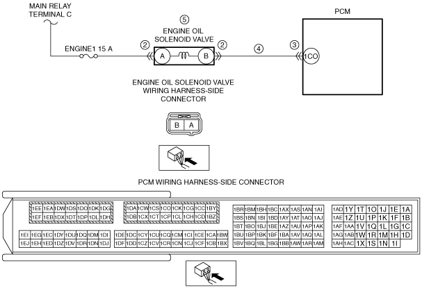 Refer to the wiring diagram and verify whether or not there is a common connector between engine oil solenoid valve terminal B and PCM terminal 1CO.