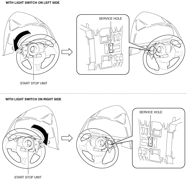 6. Rotate the steering wheel until the service hole is visible in the position shown in the figure.